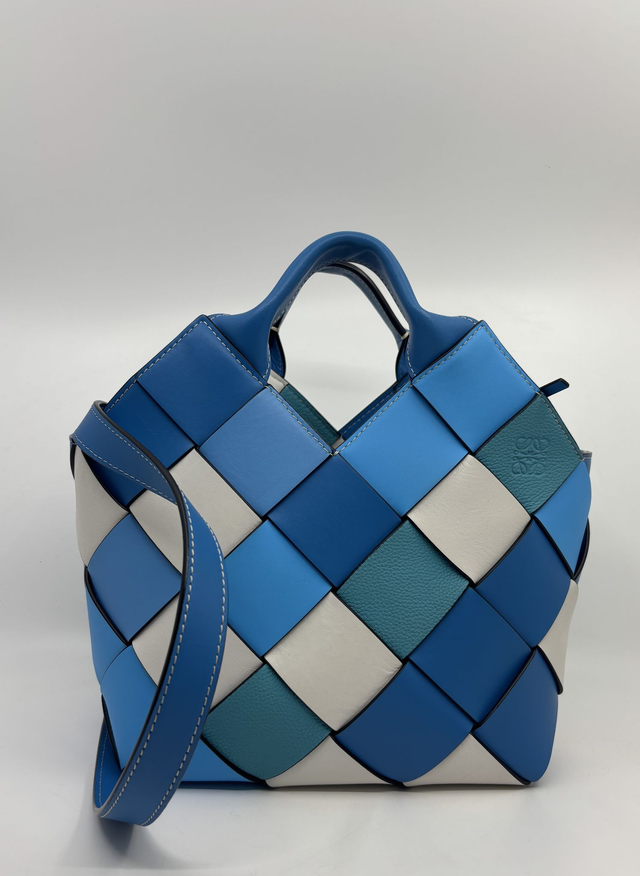 Una cesta tradicional reinventada por Loewe con tiras de piel de ternera clásica y piel de ternera graneada suave tejidas parea crear un efecto de tablero y rematada con asas superiores de piel de ternera enrrolladas.